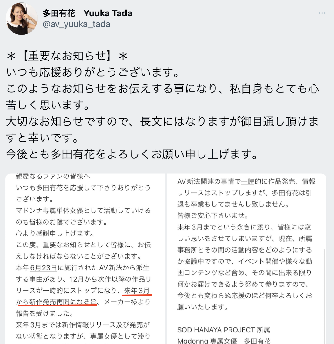 来看片商Madonna专属女优「多田有花」的发文,她在11月22日发完作品「息子の友达の制御不能な绝伦交尾でイカされ続けて…」后到了下个月就跳过发片,那她要什么时候才能回到战场?在文中她透露要到明年3月才会恢复发片,也就是说她要连休三个月〜