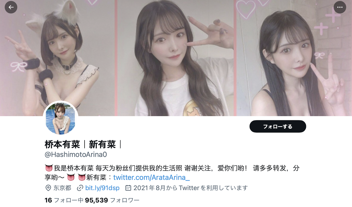 在这里和大家解释一下,日本事务所是会授权做中文帐号的,不过他们的目标是微博(Weibo),而且还要身分认证蓝勾勾,没有蓝勾勾他们是不要的,但就我打听的结果是微博最近的审核很严,AV女优要拿到身分认证不太容易,有些人信誓旦旦地说他们可以处理但到现在也没看谁搞定过,所以微博上的每一个新ありな(新有菜)都没有得到官方授权也不是本人经营;至于twitter,经纪公司的想法很简单,女优自己经营就好,twitter的翻译功能虽然超级不精准但也没必要找人中文化,因为现在要经营twitter已经不容易,除非像Nia这样有中文底子也想吸台湾粉丝,要不然干嘛成立其他帐号稀释自己的流量?