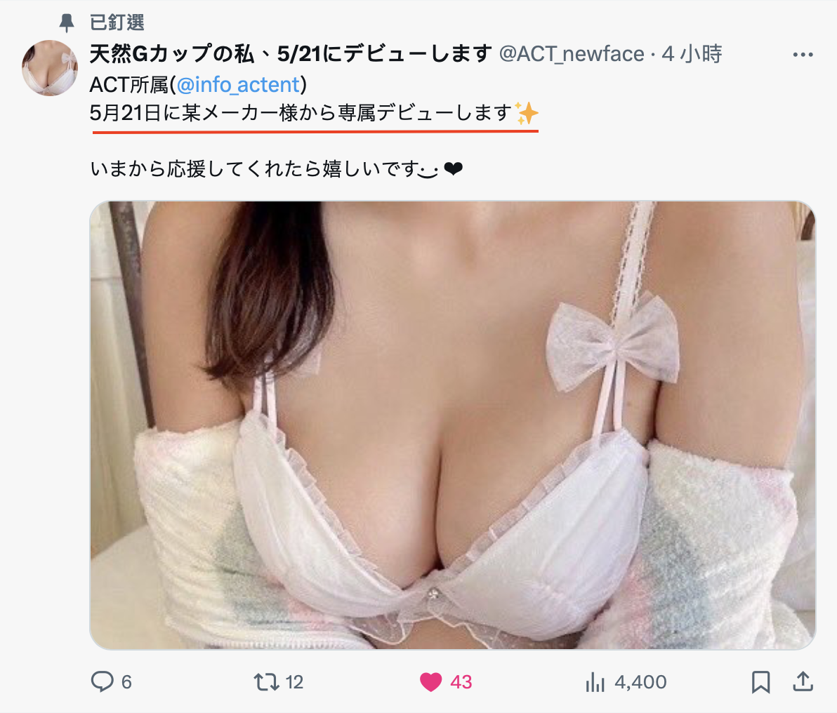 经纪公司ACT昨天让这位「天然Gカップの私、5/21にデビューします」(天然G罩杯的我,将会在5月21日出道)注册了X的帐号(https://twitter. com/ACT_newface),目前已经有了超过350个追踪者〜