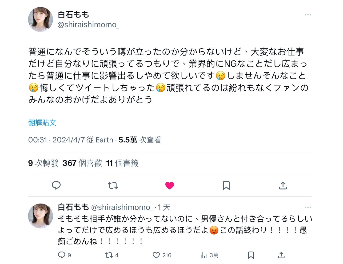 为什么她这么不开心?原来她在X(https://twitter.com/shiraishimomo_)自爆最近业界流传她的绯闻,很多人以为她和某个男优在谈恋爱⋯