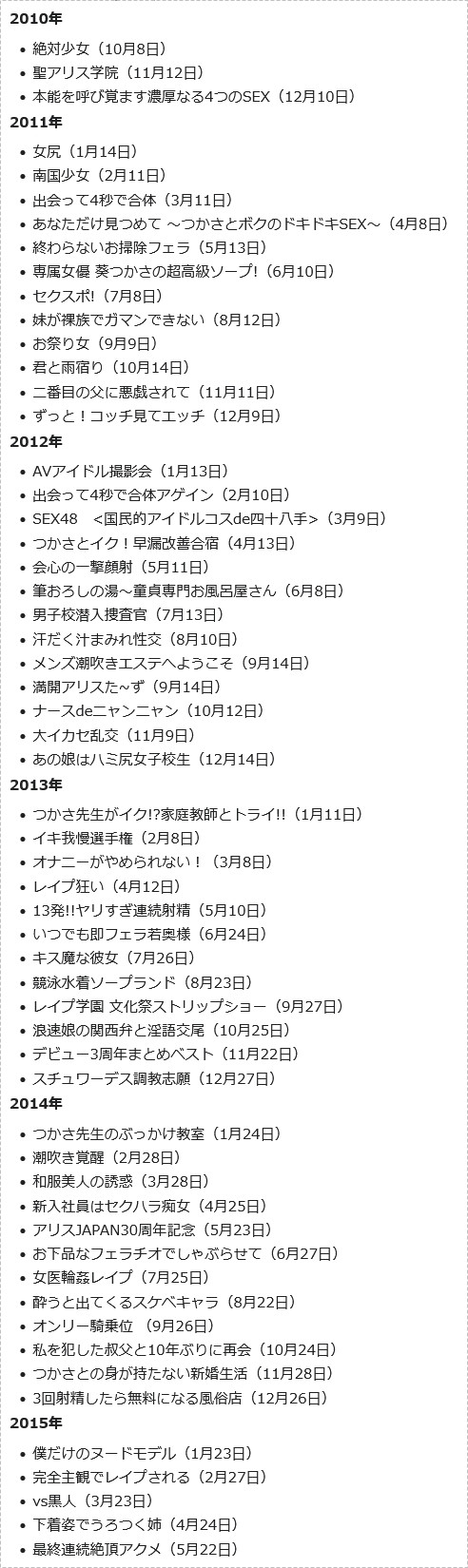 但现在诡异的状况来了:同样也是安斋らら(安斋拉拉)的事务所エイトマン(8MAN),老大姐「葵つかさ(葵司)」被发现把アリスJAPAN时代的作品于FANZA大量下架ー日本AVer已经将下架的作品整理出来,可以看到虽然有些精选辑还在但绝大部分的作品都找不到了: