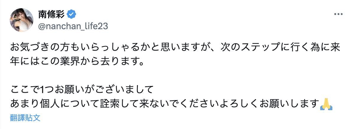 这有点奇怪了,引退不是什么大事,南条彩为什么希望不要去打探她的状况? 最直接的联想就是她确实有事情不想给大家——不过说是因为经纪人知道最近在社群上出现太多爆料帐号不了,大部分内容都是根据没有的胡乱猜想,也已经有女优打算提告了,南条彩只是先打预防针叫大家不要乱猜,她没有做什么不可告人之事…