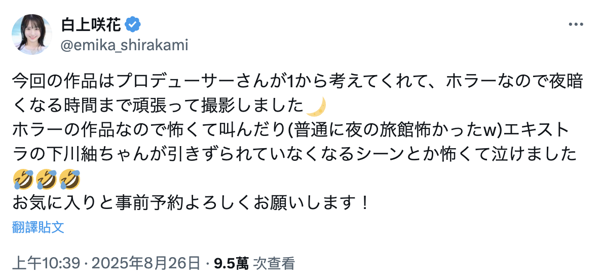 又是温泉饭店又是废墟又是找来「下川紬」共演然后还设计了女大学生消失一年的剧情,这当然是For白上咲花的特别企划;白上咲花也在自己的X(https://x.com/emika_shirakami)谈到这支作品,她说制作人对这支作品的设定就是「恐怖片」,所以很多场景是在入夜以后才拍摄的,在废墟场景气氛诡异的情况下她是愈拍愈忐忑不安,看着下川紬被拖走让她真的吓到哭了出来⋯