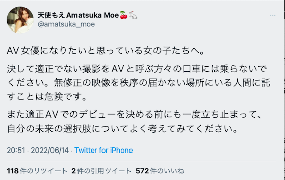 一直很关注新法的天使もえ(天使萌)在第一时间是这么说的:新法过了是非法管道的利多,未来那儿会比五更肠旺还要旺,认真做事的适正AV(就有码界)人士会发现自己和笨蛋没两样;另外,由于对AV界的未来极度不安,所以天使もえ(天使萌)也对想要进军AV界的女孩喊话,请绝对不要被FC2等非法管道的卖家给骗了,他们是无法可管的,和他们拍了无修正(无码)的作品是没有办法后悔的;另外,就算是要去和适正AV(有码界)合作前也想要想想,不要急着做决定: 为什么?天使もえ(天使萌)是什么意思?