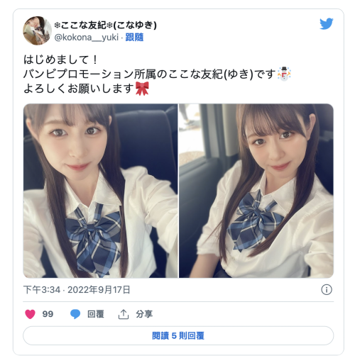 其实她的外型和演出都蛮不错的,只可惜当时她没有社群、拍完出道作人就不见了,直到9月她才用ここな友纪(心花友纪)的名字回归⋯