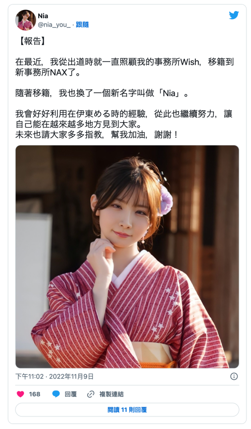 算了,回来就好,剩下的再说吧,只要还想做那移籍换事务所也是一个选项,像台日混血的「伊东める(伊东爱瑠)」就在昨天宣布更换事务所为NAX,也将艺名更改为「Nia」: