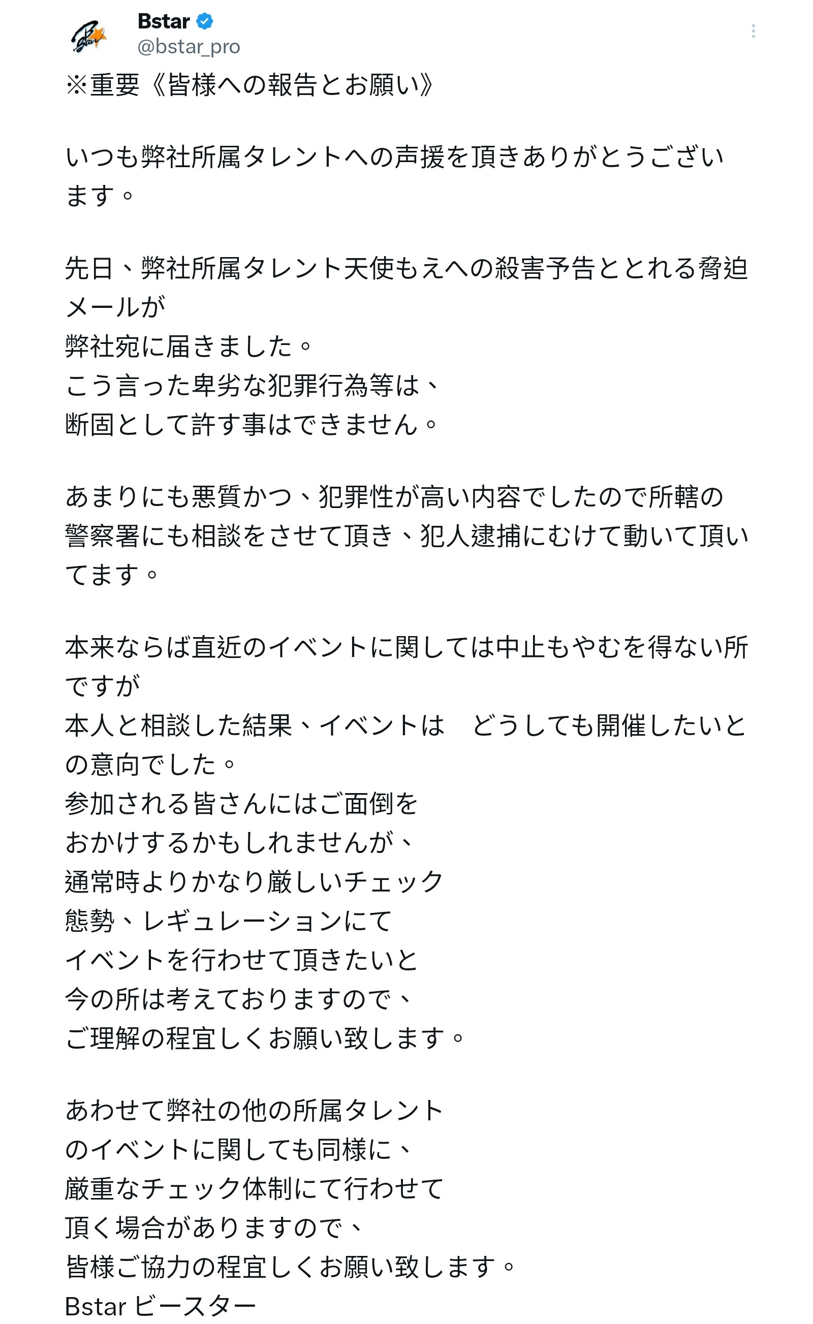 继桃乃木かな(桃乃木香奈)后,又有女优接到了死亡威胁—那就是经纪公司BStar的王牌「天使もえ(天使萌)」,对方是寄信威胁说要在活动的时候对她不利,让事务所如临大敌: