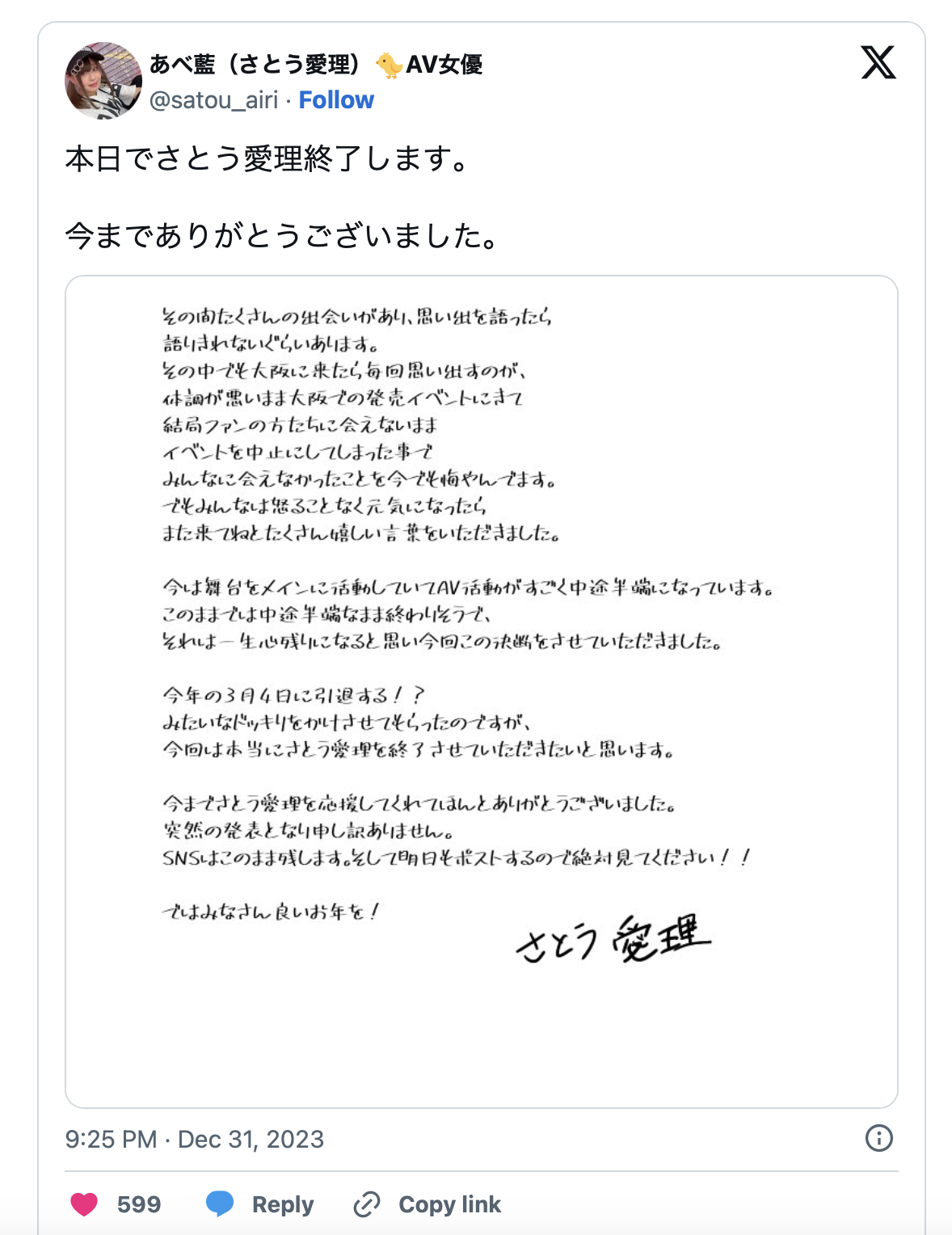 对,她是さとう爱理(佐藤爱理),2014年出道的巨乳小只马,还记得那时候她是キャンディ(Candy)和哈比人片商ミニマム共同的专属女优,结果十年过去了,两家片商都倒了,她也斜杠参加了脱衣舞和舞台剧的表演工作,然后在去年年底12月31日的时候,她说要把精力集中在舞台剧,所以AV引退。
