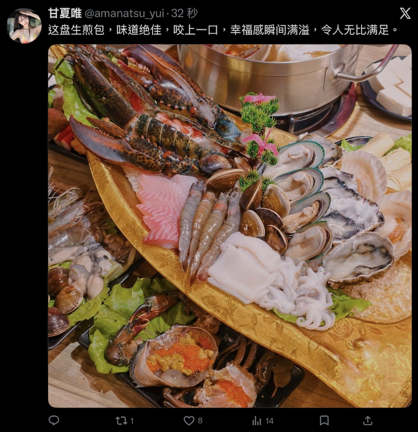 甘夏唯是在社群上傳了高檔食材的照片搭配簡體中文的說明:「这盘生煎包,味道绝佳,咬上一口,幸福感瞬间满溢,令人无比满足。」