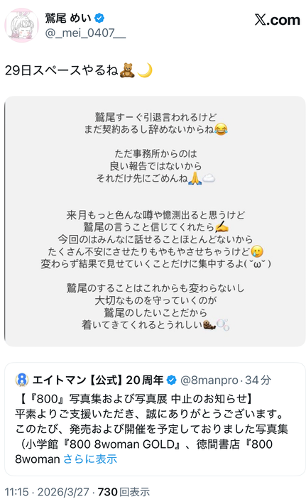 莫名其妙冒出这么一篇真的有点奇怪,但鹫尾所属的经纪公司エイトマン(8MAN)有更奇怪的事:他们在官方X(https://x.com/8manpro)宣布,不只原定预定举办的写真展没了,就连和两家出版社谈好的写真集连动计画也取消,虽然没有说明原因,但已经让人闻到不对劲的味道惹~